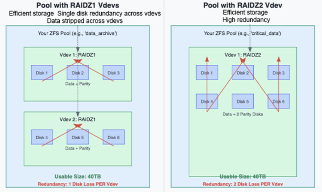 Vdev 冗余是局部的: ZFS 中的冗余是局部的,不是在整个池上共享。请确保规划 vdev 布局以实现所需的强度。